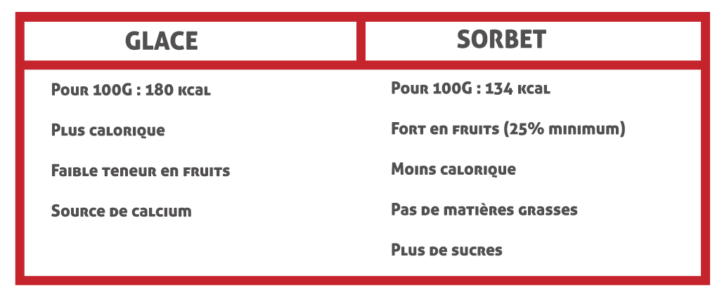 D’un point de vue général, le sorbet est plus sain que le glace, mais contient aussi plus de sucres.